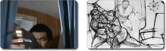 À gauche, l’homme en question, apparaissant très brièvement. À droite, une image provenant du story-board, prouvant que Bond était censé se battre avec lui.