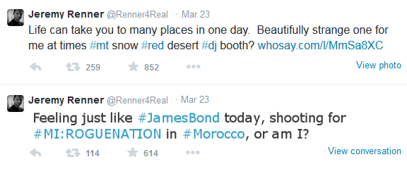 Qui servira donc de doublure à Daniel Craig pour le tournage des cascades au Maroc ? La bande-annonce de Mission Impossible: Rogue Nation nous fait apercevoir Jeremy Renner dans une impressionnante cascade dans la ville marocaine d’Aguadir et sur les autoroutes, et l’acteur est bien connu pour se doubler lui même. C’est en tout cas la suggestion de Medinafr.ma qui a aperçu Jeremy Renner aux cotés de l’équipe de SPECTRE.